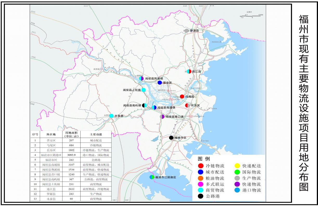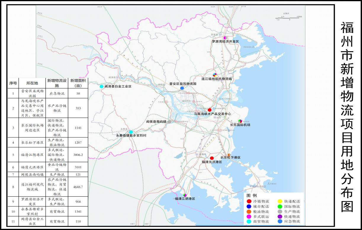 福州邮政快递处理中心项目42亩、福建翔福长乐翔福物流园项目425亩、福州旭东卓风物流京东亚洲一号福州长乐物流园项目159亩、福州传云物联网技术菜鸟网络项目283亩、长乐同正仓储物流园项目60亩、长乐利嘉国际航空国际物流园项目242亩、福建珊瑚食品农产品加工与冷链物流中心项目591亩。 小计:项目数7个,总用地规模1802亩。 |