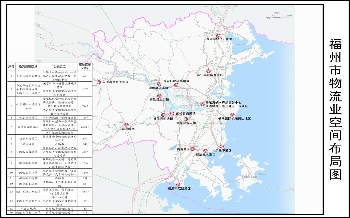 依托长乐区、福清市、罗源县、闽侯县等产业集群,结合国家生产服务型物流枢纽建设,通过新建配建,以及改造提升现有物流设施,优化生产物流集聚区空间布局,分别形成罗源湾北岸、江阴港区、松下港区、长乐国际机场周边地区和闽侯县南屿镇、青口镇生产物流集聚区。