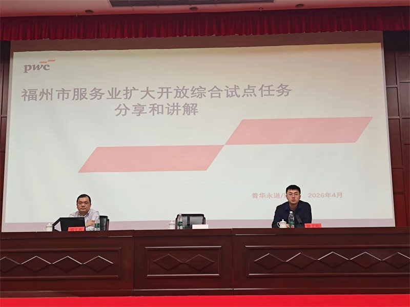 为贯彻落实市政府专题会议精神、全面推动福州市服务业扩大开放综合试点工作提质提速、落地见效,2026年4月10日下午,福州市服务业扩大开放综合试点工作培训会议在东部办公区多功能会议中心">隆重召开。本次会议由福州市商务局主办,特别邀请普华永道专家团队作专题授课。市商务局党组成员、副局长陈正勋出席会议并致辞,福州新区管委会、各县(市)区人民政府,市委宣传部、市委金融办、市发改委、市委网信办、市卫健委、市人社局、市司法局、市数据管理局、市市场监管局等70多家市直部门、各县(市)区、各开放平台和有关单位负责同志参加了本次培训,实现了试点任务涉及单位全覆盖。