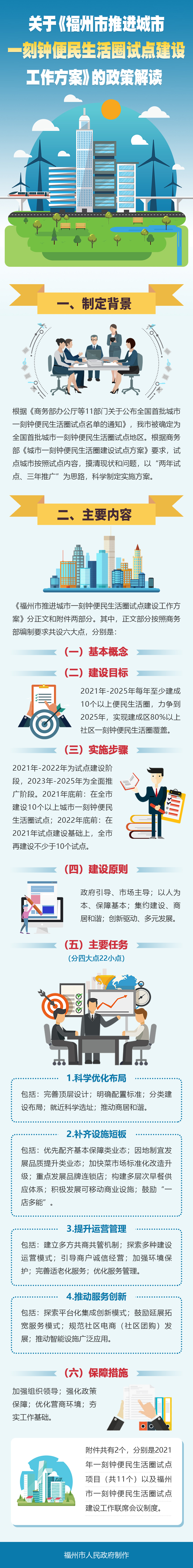《福州市推进城市一刻钟便民生活圈试点建设工作方案》分正文和附件两部分。其中,正文部分按照商务部编制要求共设六大点,分别是: